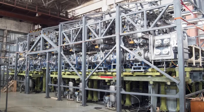 Установка представляет собой полностью автоматизированный комплекс, состоящий из восьми газовых и вакуумных толкательных печей, предназначенных для проведения сложных процессов спекания и осаждения, объединенных автоматической транспортной герметичной линией. Комплекс способен работать в режиме 24/7 в течение года без необходимости присутствия обслуживающего персонала.