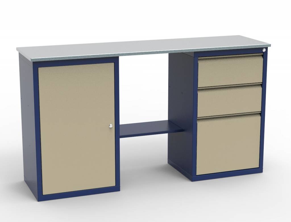 Комбинированная модель верстака слесарного с 2 мя тумбами и узкой столешницей – пользуется популярностью у владельцев гаражей и небольших мастерских автосервиса. Именно они заказывают такой вариант рабочего стола чаще всего. В чем же его привлекательность? Столешница крепится на две тумбы-опоры: одна из них имеет дверцу и внутреннюю разделительную полку, а вторая оборудована выдвижными ящиками (рассчитанными на нагрузку 30 кг). Такая компоновка позволяет слесарю-ремонтнику разместить большое количество запасных частей, деталей, инструментов, фитингов, используя лишь внутреннее пространство верстака.