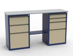 Интернет-магазин предлагает купить верстак слесарный двухтумбовый с выдвижными ящиками – этот вариант рабочего стола востребован владельцами автосервиса и ремонтного бизнеса, а также его легко можно разместить в гараже и подсобном помещении дачного домика. Узкая столешница крепится на две тумбы-опоры, оборудованные выдвижными ящиками. Такая компоновка позволяет слесарю разместить во внутреннем пространстве рабочего стола инструменты, запасные части, ремкомплекты, фитинги и другую арматуру.