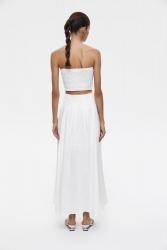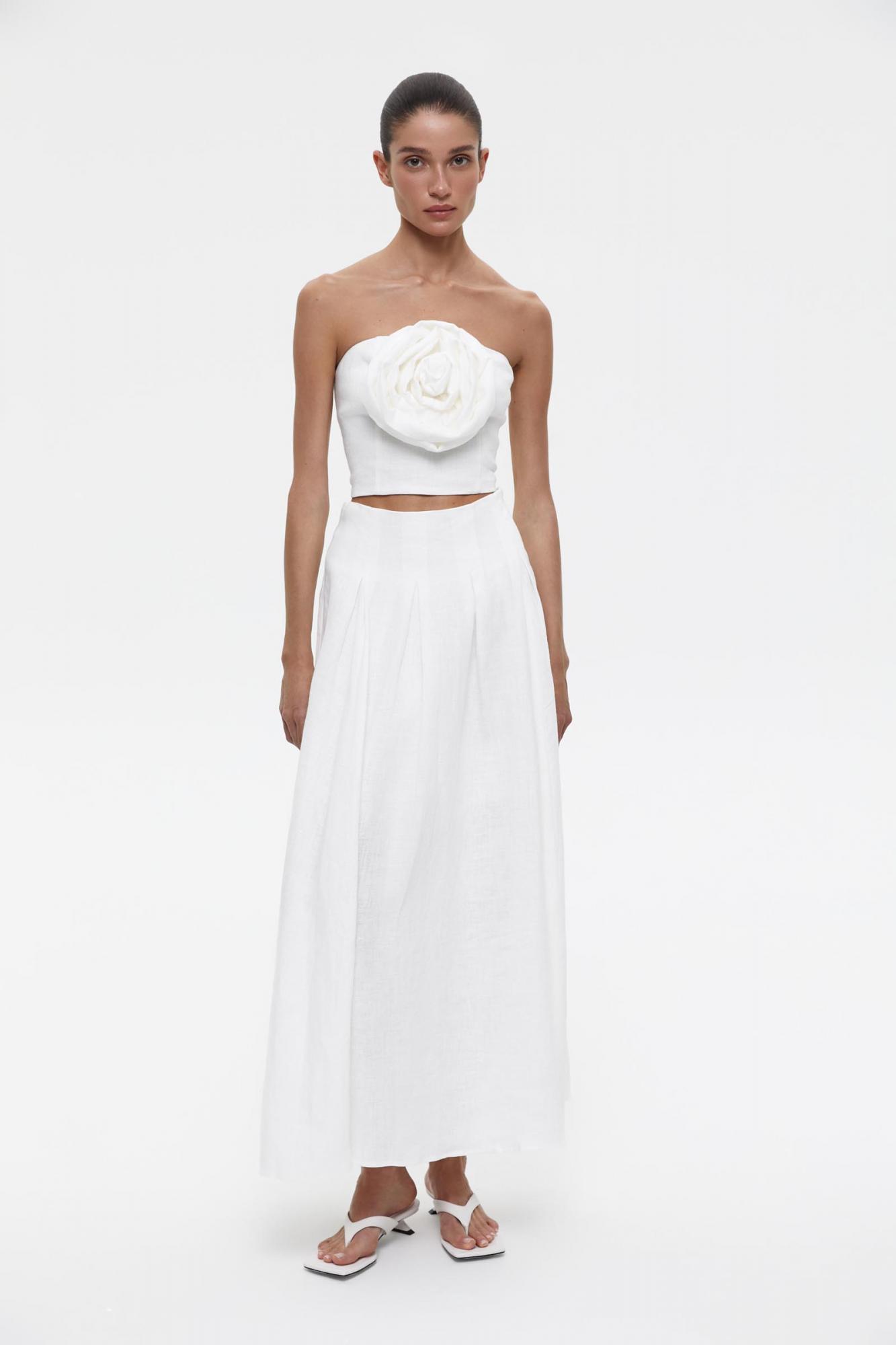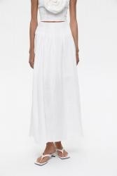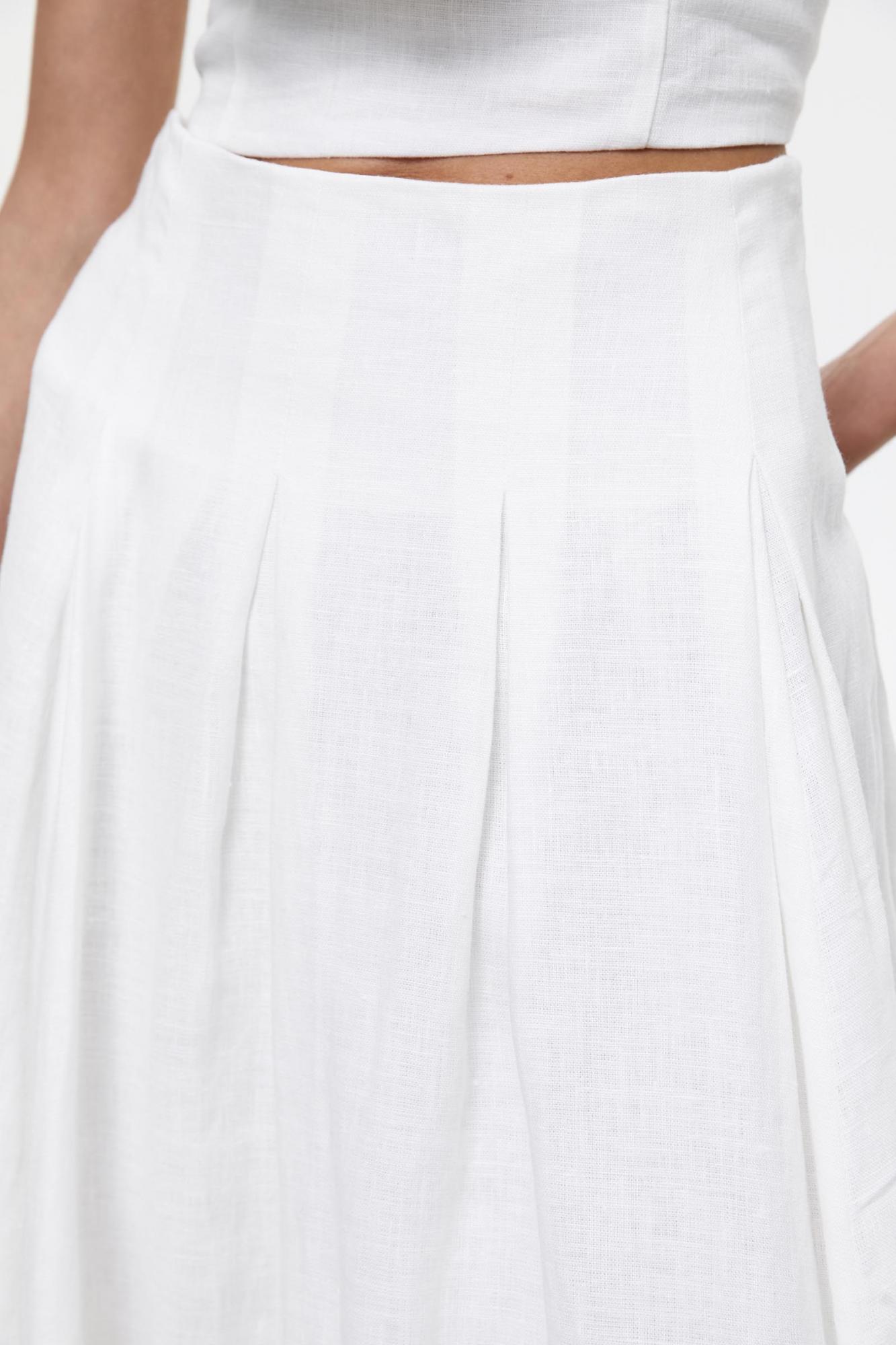 Юбка макси свободного силуэта изо льна. Юбка выполнена с посадкой на бедрах, ткань нежно струится при ходьбе. Особенностью модели являются бантовые складки, которые добавляют нежного объема изделию. Юбка застегивается на потайную молнию.