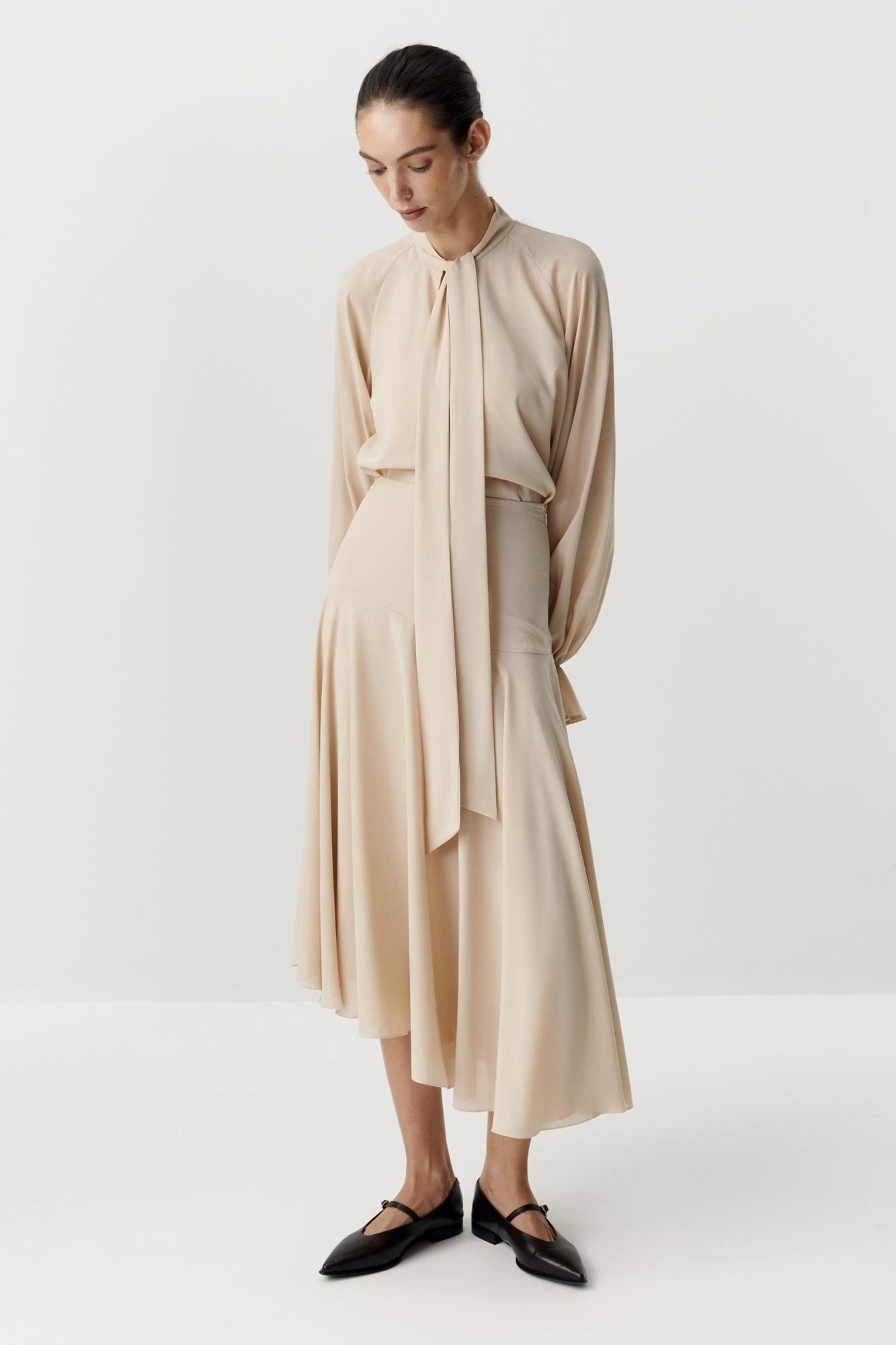 Юбка в стиле бохо из мягкого полупрозрачного шифона. Модель имеет фигурную, плавную линию реза по бедрам. От бедра начинается начинается легкое расклешение. Модель свободная и воздушная. Изделие на подкладе.