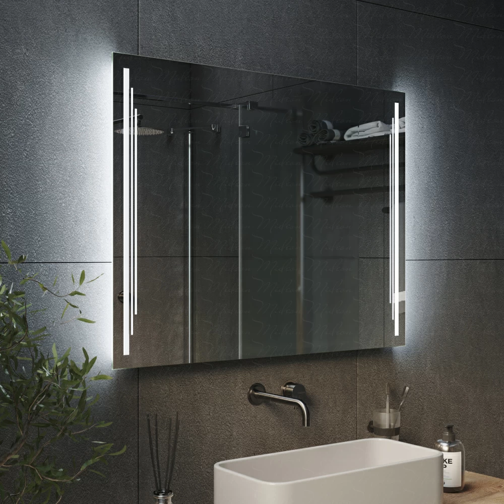 Зеркало с подсветкой EcoLine Ambilight имеют толщину всего 24 мм благодаря применению современной LED (светодиодной) подсветки, премиальных комплектующих и собственным производственным наработкам. Зеркало оборудовано сенсорным выключателем со встроенным диммером (возможностью регулировать яркость подсветки). Выключатель имеет приятный белый цвет и не раздражает глаз (в отличии от синих выключателей).