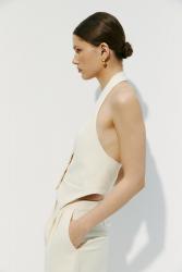 Приталенный жилет из фактурной ткани. Особенно женственным акцентом модели является открытая спина. Изделие застегивается спереди на три пуговицы.
