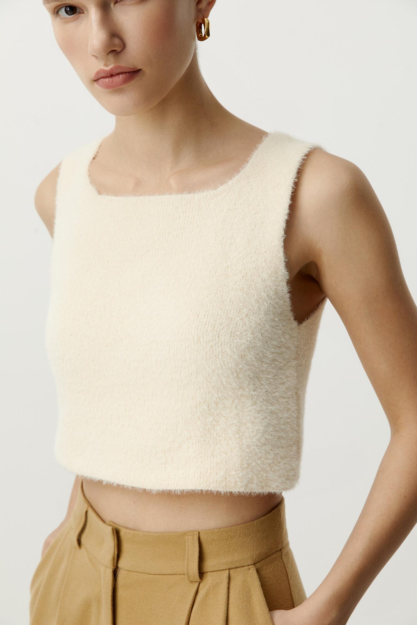 Укороченный вязаный жилет с прямоугольным вырезом - стильная новинка, которая отлично подойдет на повседневный образ. Пушистая деликатная пряжа приятна к телу и комфортное в носке.