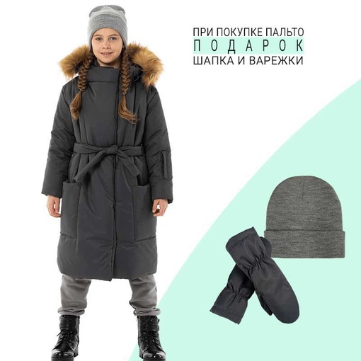 ПОДАРОК! Шапка двойной вязки в цвет пальто и мембранные краги из основной ткани, на утеплителе холлофан 120 с подкладкой из флиса. размерный ряд на рост от 134-140 до 158-164