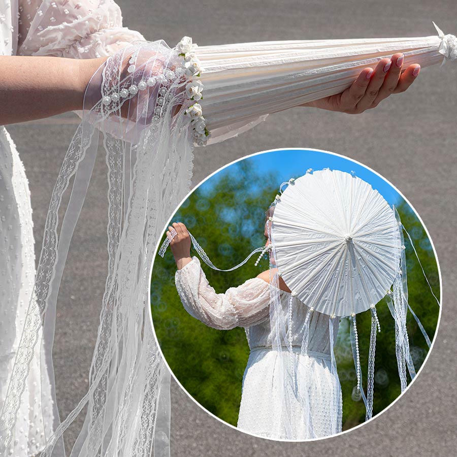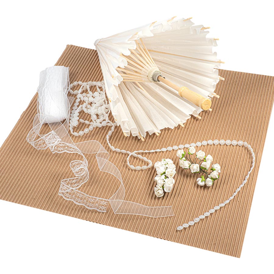 В набор входит: Зонт декоративный под раскраску складной D= 600 мм, L=420 мм-1 шт; Цветок "Роза" 20 мм (белый) букет 12 шт-2 упак; Тесьма декоративная пластиковая полубусины "Цветок" 9,5 мм (белый)-2,5 м; Кружево капрон 20 мм арт. 133-1 (белый)-7 м; Лента капроновая 20-25 мм (белый)-7 м.