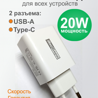 Сетевое зарядное устройство АксБери 20W 1x USB Type A, 1xUSB Ty...