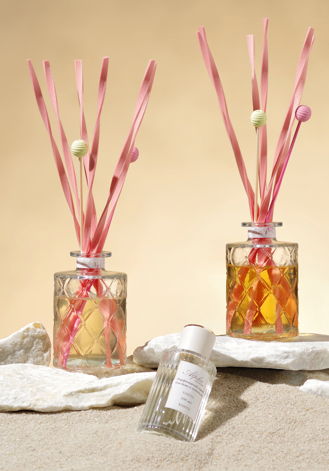 Парфюмерные композиции Alpha aroma отражают близость к природным ароматам и характеризуются важными факторами: использованием натуральных и сертифицированных компонентов европейских производителей, точным соблюдением рецептуры и всего технологического процеса производства. Присутствие натуральных эфирных масел в диффузорах с палочками и парфюмированных спреях для дома придает звучанию ароматов многогранность и живую силу.