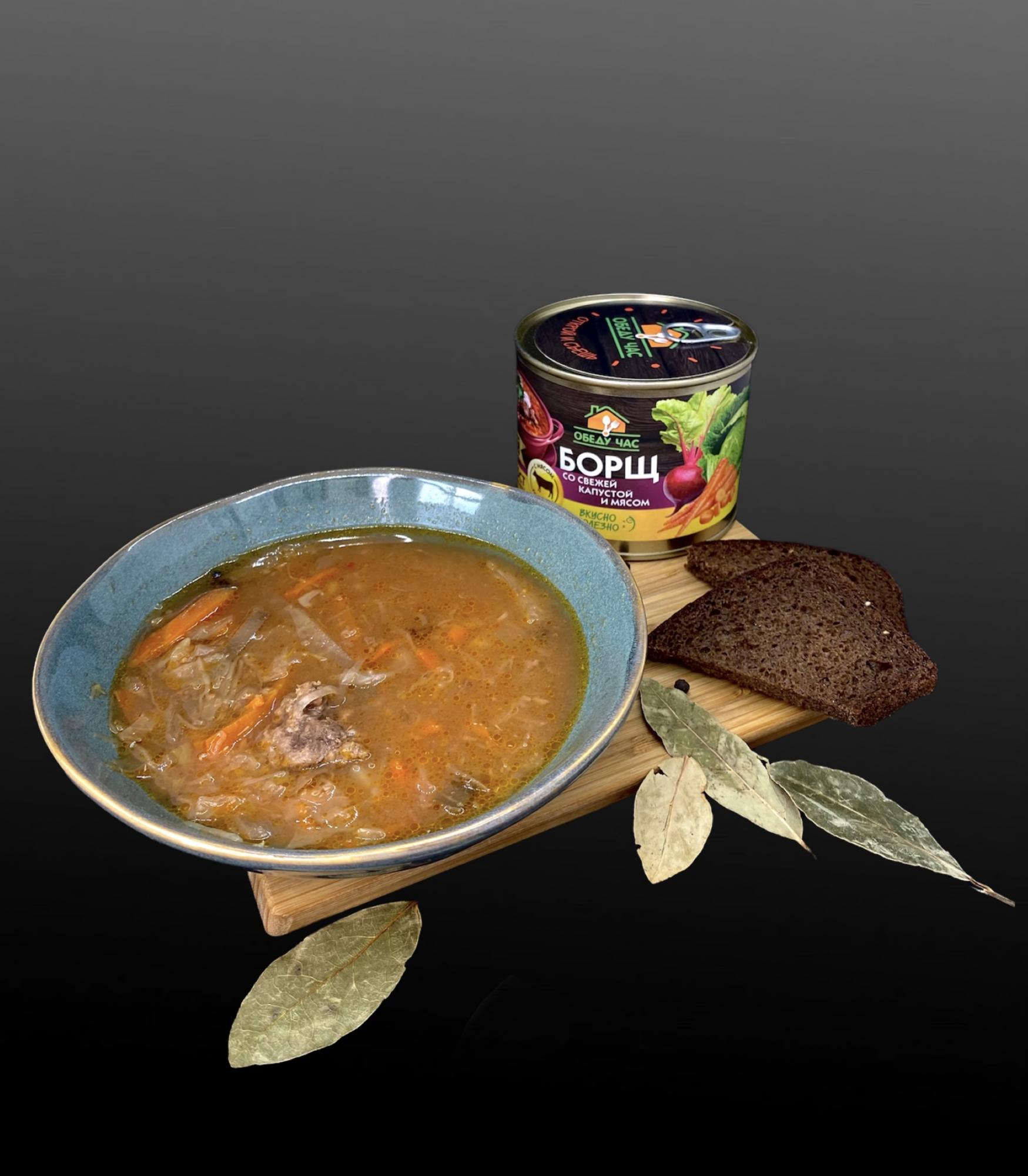Консервированная еда длительного хранения: готовые первые и вторые блюда, тушенка.