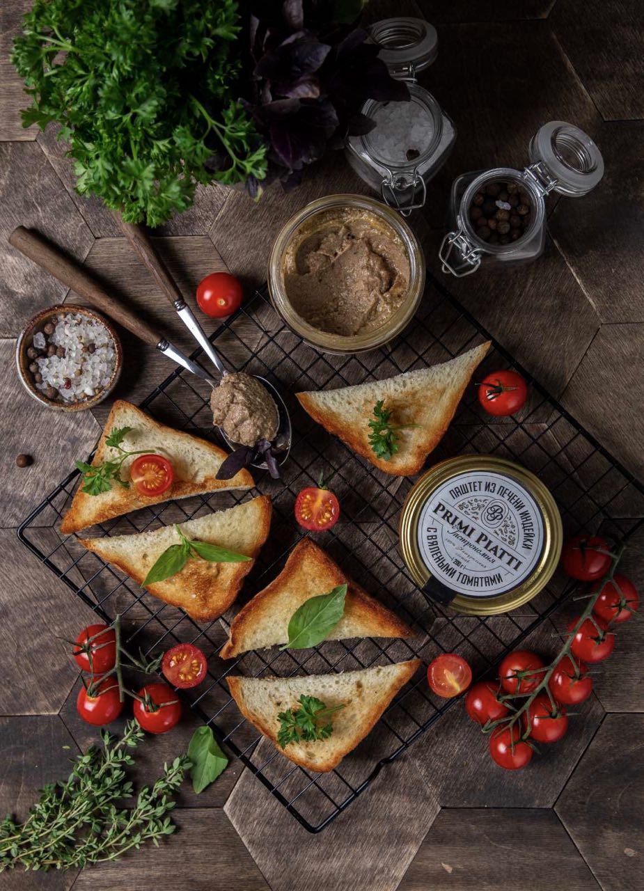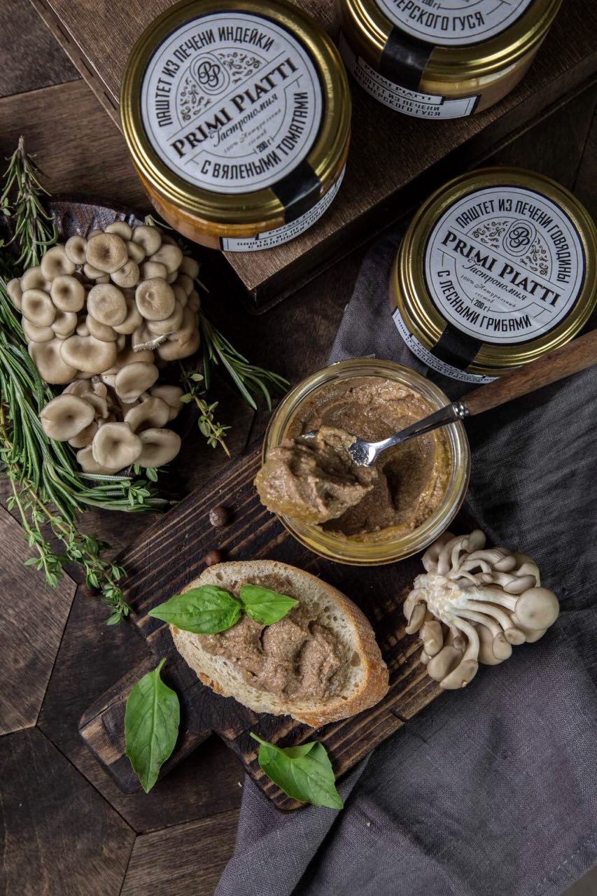 Паштеты с вяленными томатами, паштеты из фермерской утки, паштеты из лосося, паштет из говядины с лесными грибами, паштет из печени гуся, паштет из печени кролика.
