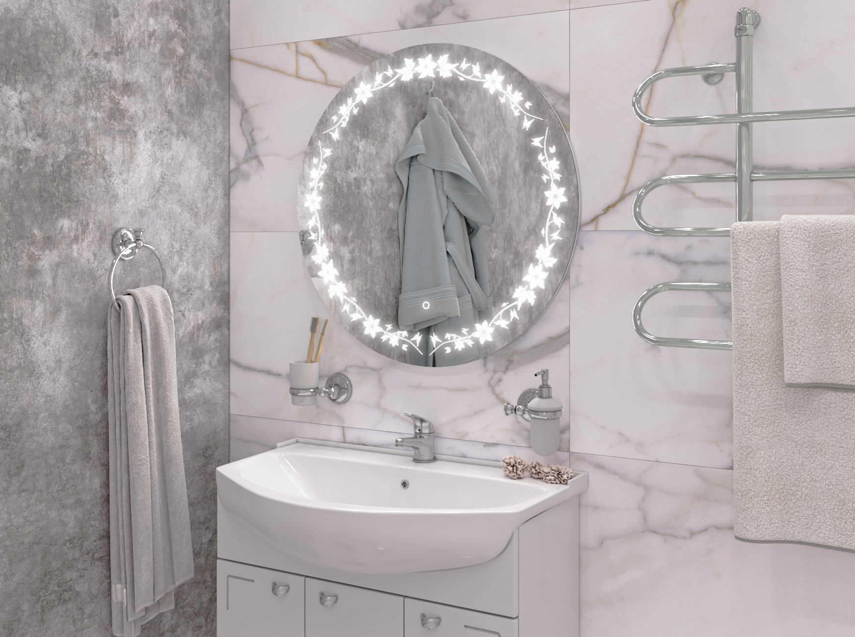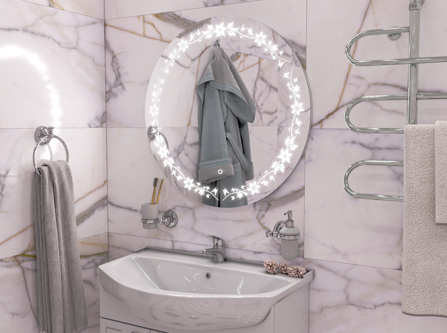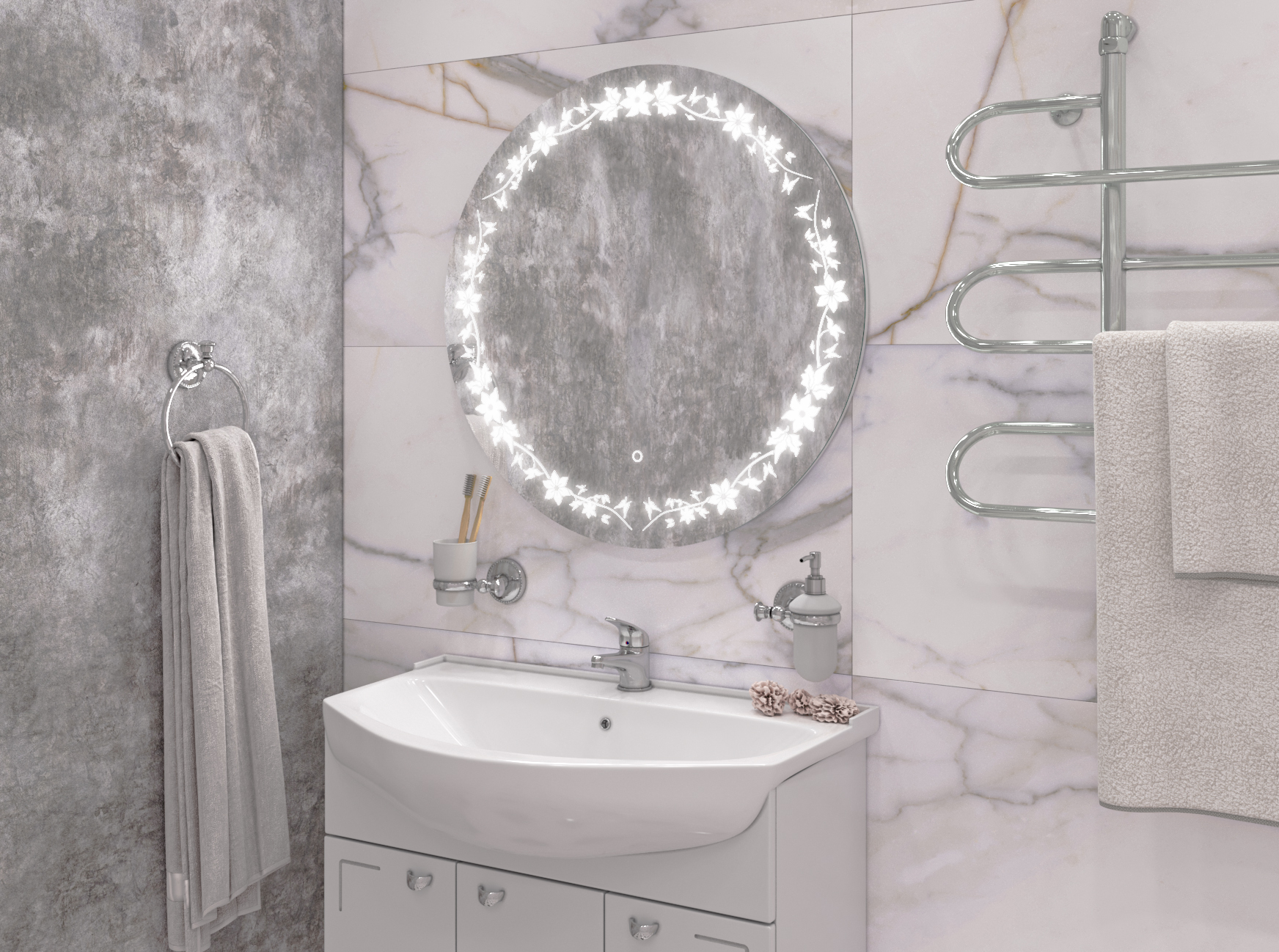 Собственное производство мебели для ванных комнат от эконом до премиум класса. Производство водяных и электрических полотенцесушителей. А также собственное производство зеркал со светодиодной подсветкой.