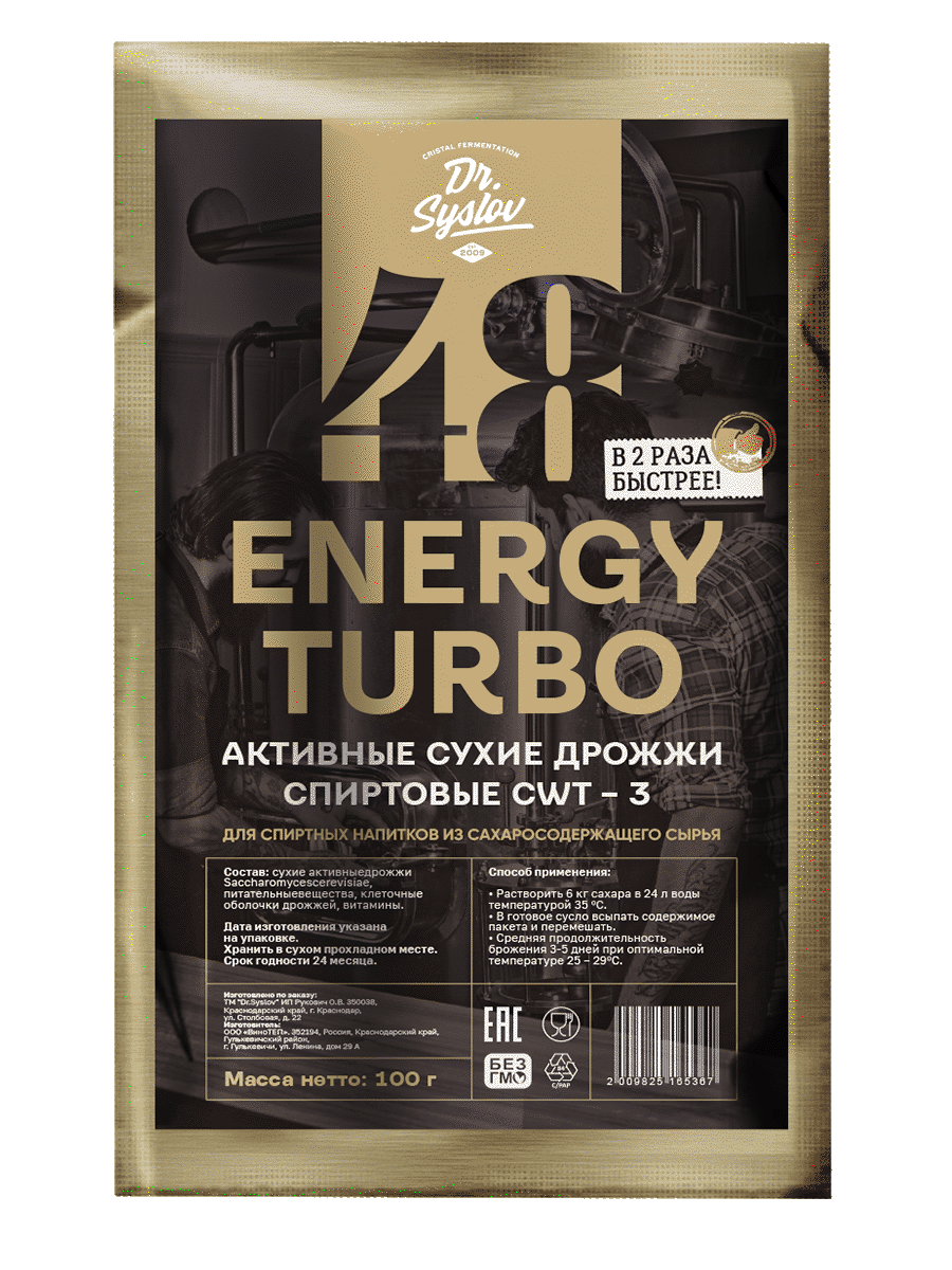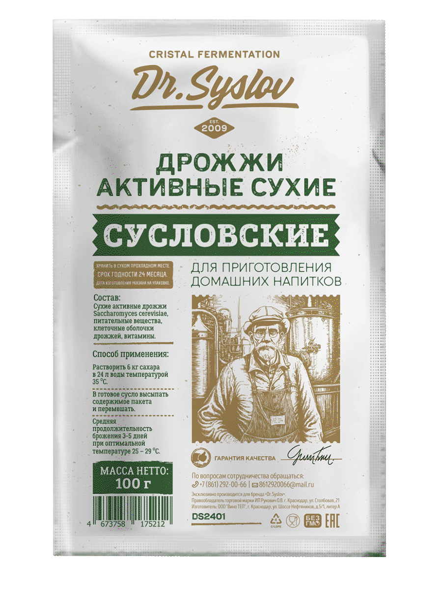"Dr.Syslov" - Российский бренд спиртовых дрожжей для приготовления алкогольных напитков в домашних условиях: от самогона до виски. В ассортимент торговой марки входит широкая линейка турбо-дрожжей, содержащих питательные вещества, витамины и специальную подкормку для активного и быстрого сбраживания.
