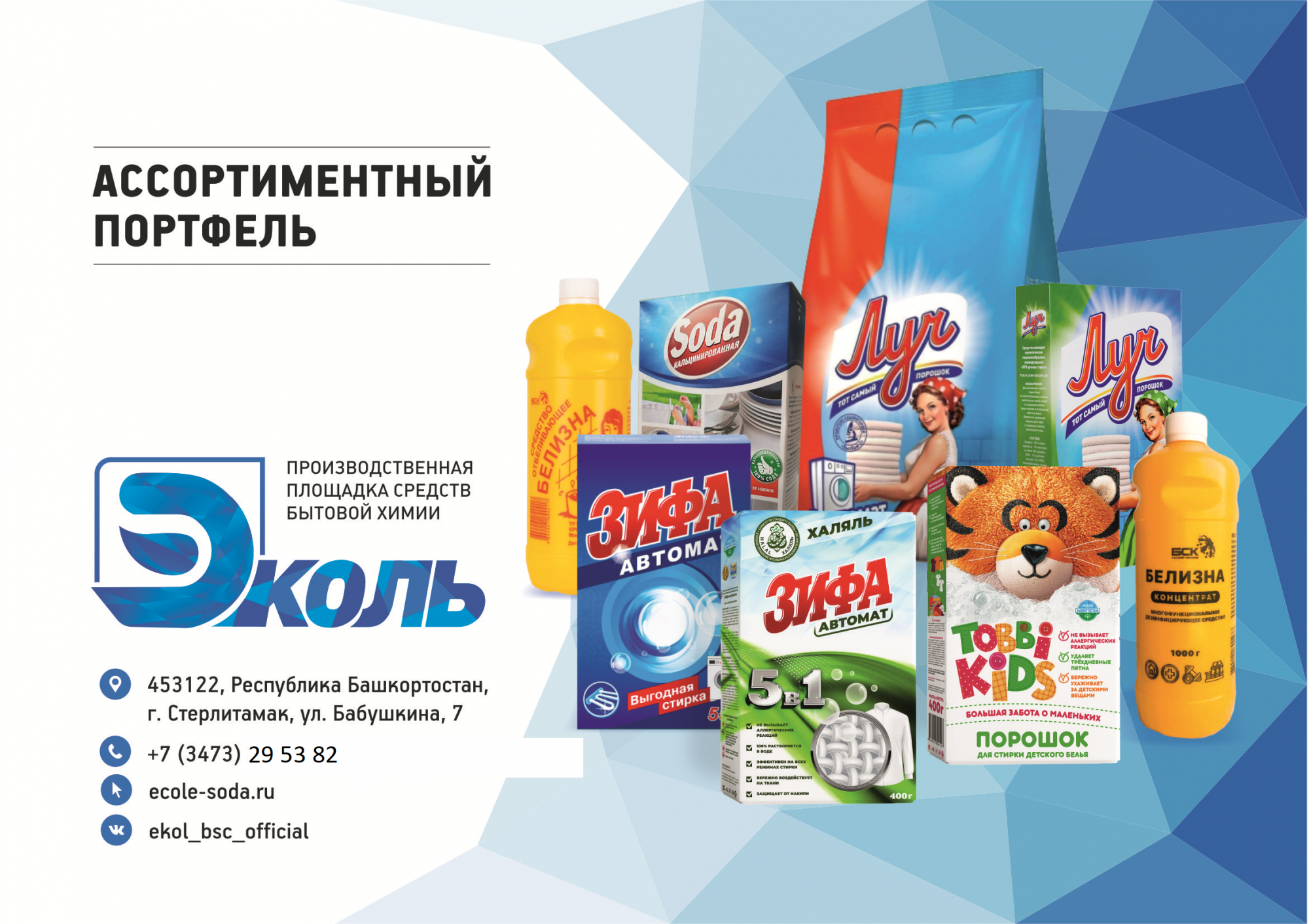 В линейке продуктов компании присутствуют как классические стиральные порошки и моющие средства: "Луч", "Зифа", Белизна, Кальцинированная Сода, так и новые бренды – порошок для мусульман «Зифа-автомат» Халяль и линия детских порошков "Tobbi Kids" (порошок, отбеливатель, пятновыводитель). Порошки ООО «Эколь» - это бренды с историей и стандартами качества, проверенными десятилетиями!