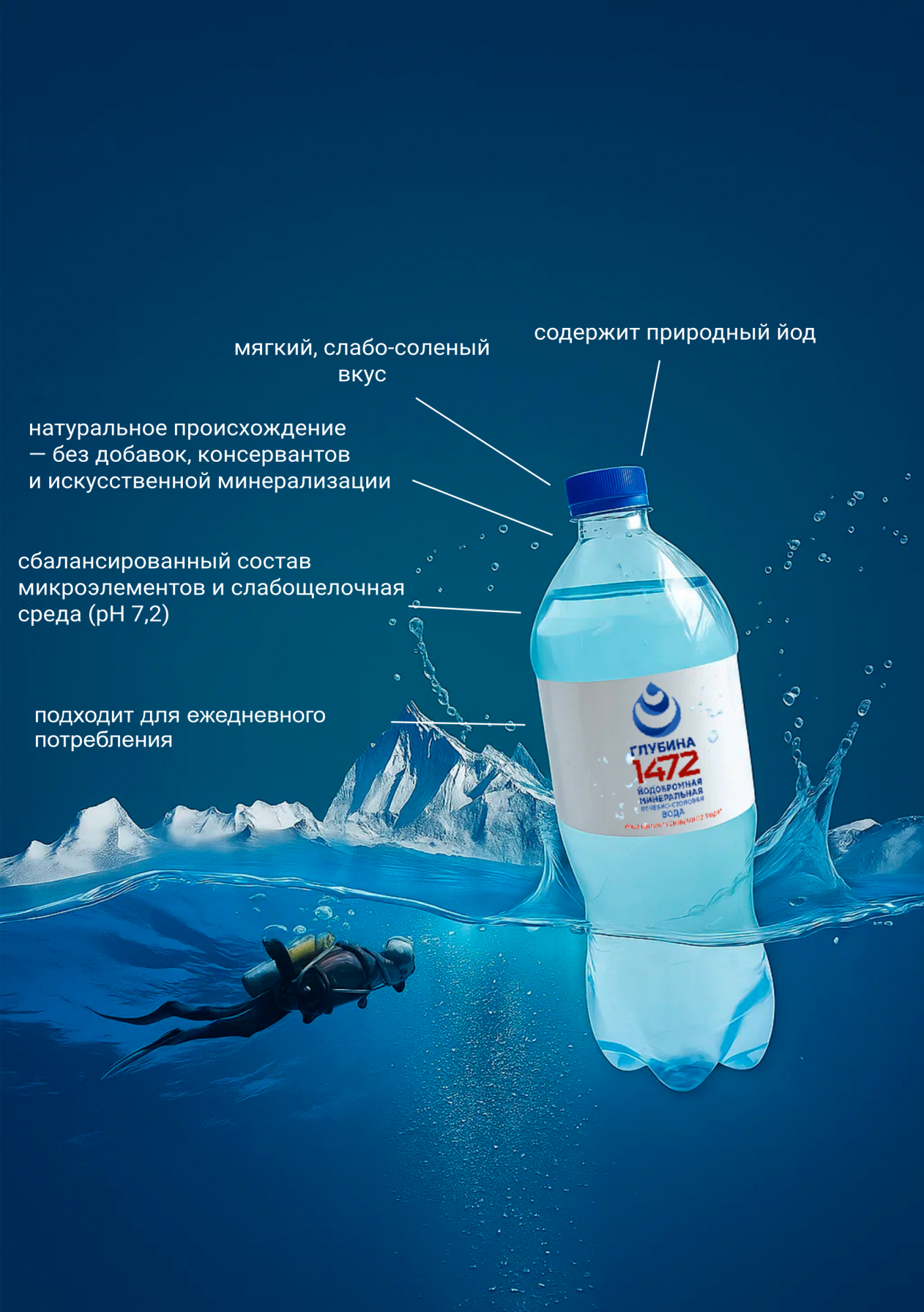 Компания «ГЛУБИНА 1472» производитель уникальной йодобромной минеральной воды премиального качества. Сырьем для воды служит натуральная высокоминерализованная вода скважины №2Р, добываемая вода с глубины 1472,7 метров в месте подземной локализации бассейна, оставшегося со времен Сибирского моря, существовавшего сотни миллионов лет назад (г. Тавда, Свердловская область). Вскрытие скважины произведено в 1958 году Тюменским геологическим управлением под руководством доктора геолого-минералогических наук И.И. Нестеровым.