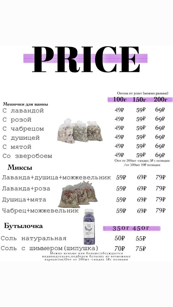 Создаем товар из натуральных Крымских даров. Розовая соль Сасык-Сиваш и травы Крымское природы: лаванда, роза, мята, зверобой, душица, можжевеловая ягода. Также желаем цветную соль с шиммером. Заказы выполняем в кротчайшие сроки. Предоставляем документы на продукцию и разрешение на торговлю, если необходимо.