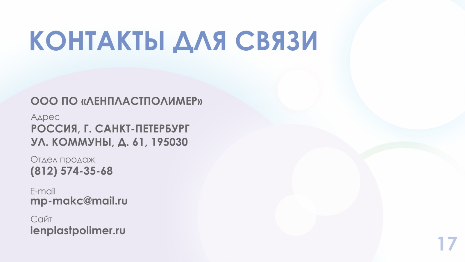 ООО ПО "ЛЕНПЛАСТПОЛИМЕР" было создано в г. Санкт-Петербурге в 2006 году. Предметом деятельности является изготовление зубных щеток полного цикла. В ассортименте зубные щетки для взрослых и детей, профессиональные для чувствительных зубов, для брекет систем, антибактериальные с ионами серебра, щетки для гостиниц. Реализуем проекты «частная марка».