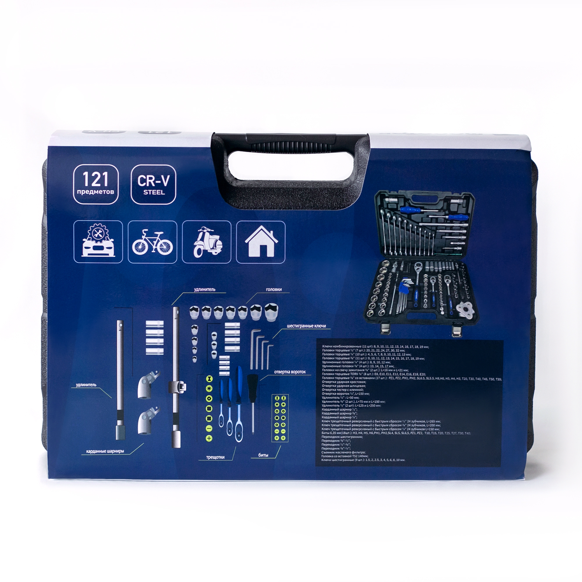 Набор инструментов для автомобиля в ударопрочном пластиковом чемодане. Металлические застежки плотно фиксируют кейс и позволяют инструментам оставаться на своих местах при транспортировке. Все инструменты выполнены из матовой закаленной высокопрочной CrV хромованадиевой стали, благодаря чему инструмент не гнется и не разрушается от коррозии.