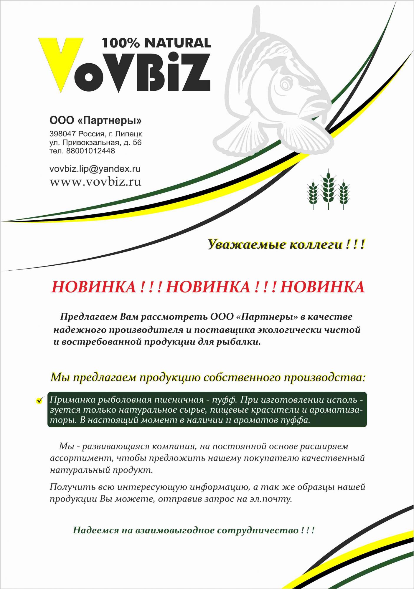 ООО «Партнеры» - производитель и оптовый поставщик экологически чистой и востребованной продукции VoVBiZ для рыбалки. Ассортиментная линейка расширяется на постоянной основе. Новый производительна на рынке рыболовных прикормок и приманок с гибкими условиями сотрудничества.