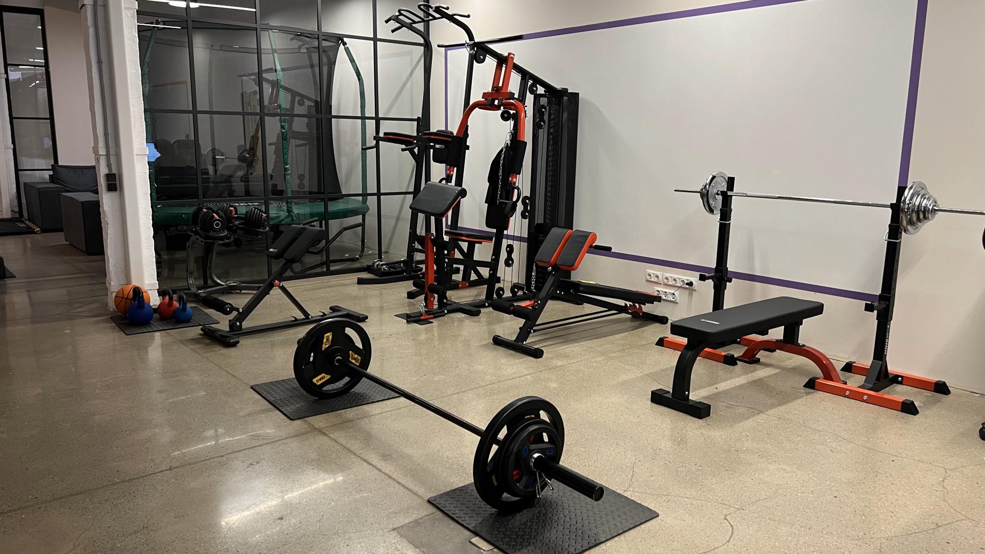 - Силовые тренажеры и свободные веса (гантели, штанги, гири, грифы, силовые рамы)